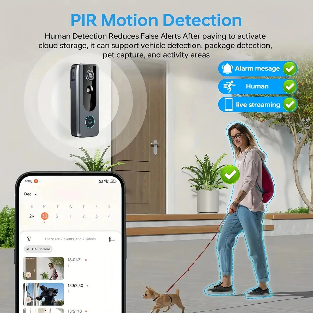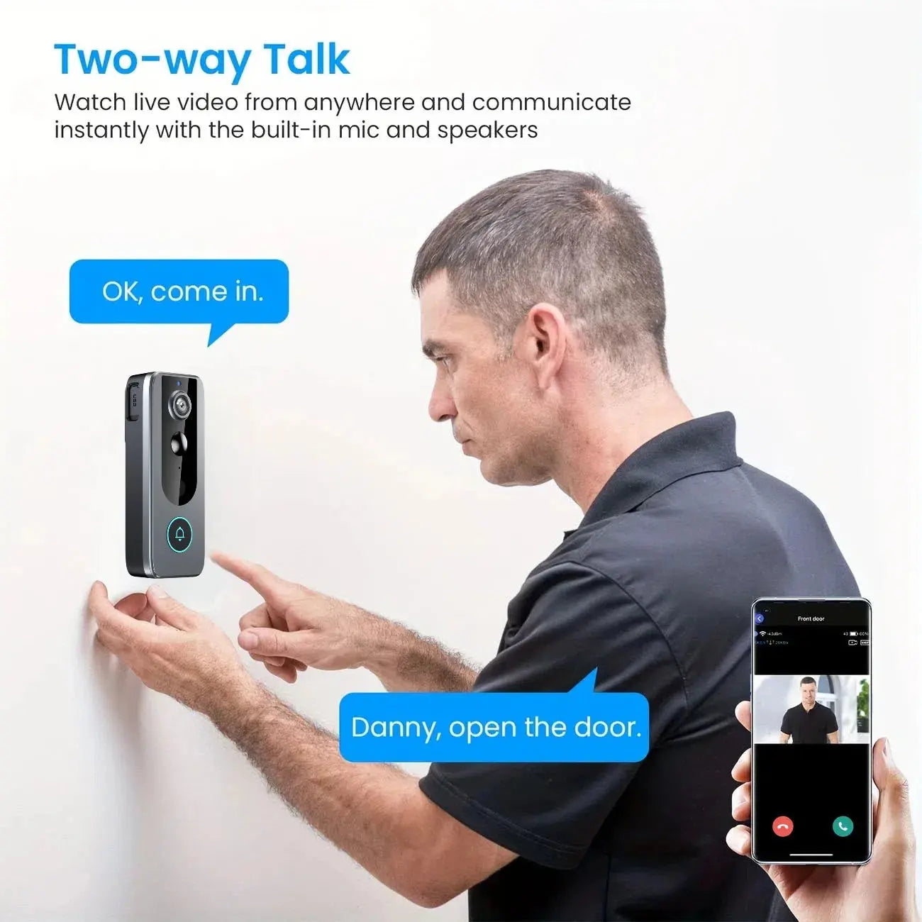 3, Conversazione video bidirezionale HD e visione notturna: il videocitofono visualizza, ascolta e parla con i visitatori con l'app scarica video e audio cristallini.Rimani connesso da qualsiasi luogo con avvisi temporali! I sensori integrati nel campanello video inviano avvisi istantanei quando viene rilevato un movimento.La chiara visione notturna a infrarossi mantiene la tua casa sicura anche al buio.